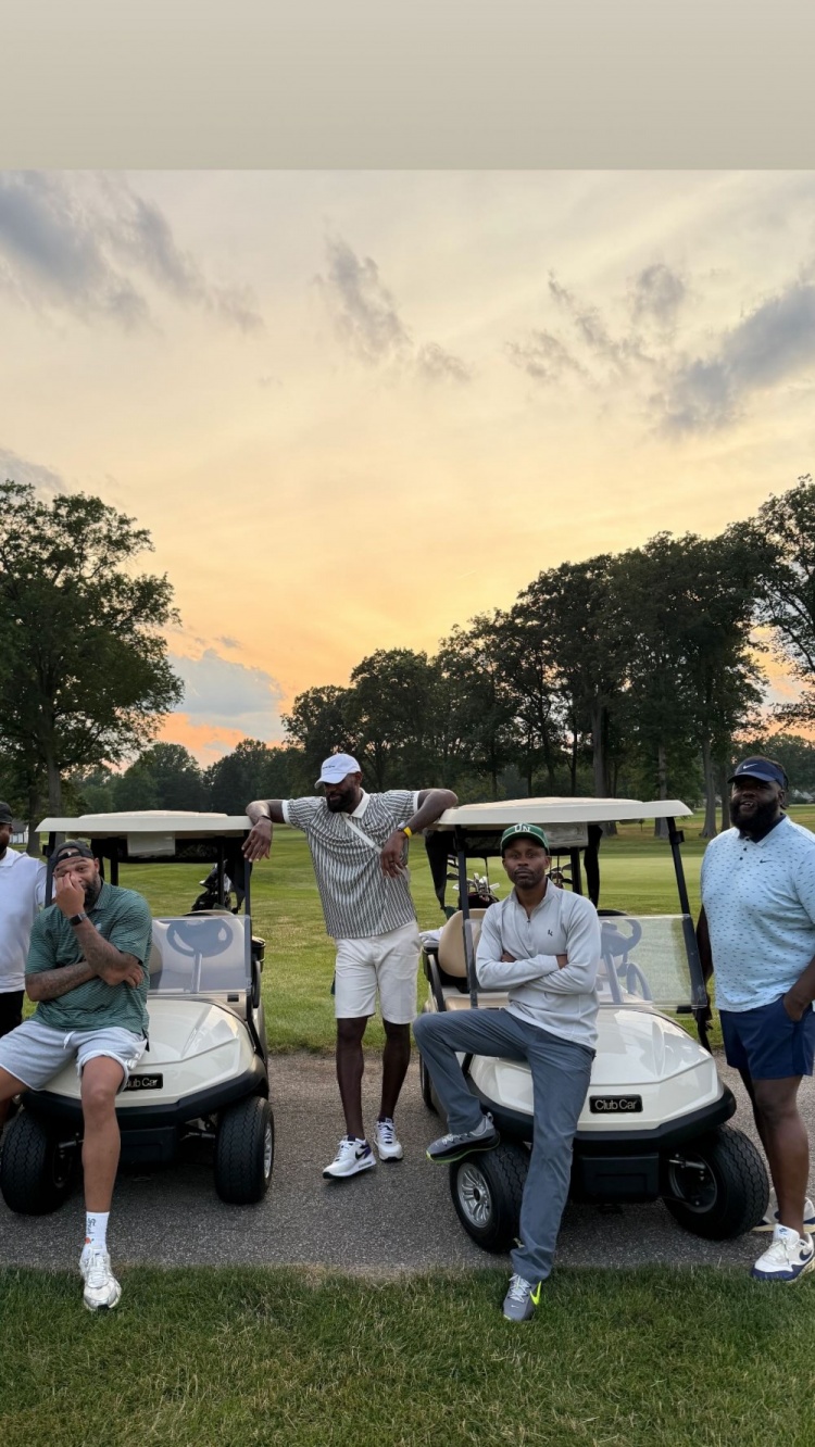 7月4日讯 今日,湖人前锋詹姆斯更新Instagram Story,转发他近日在家乡阿克伦与儿时好友、高中队友一同打高尔夫的合影。