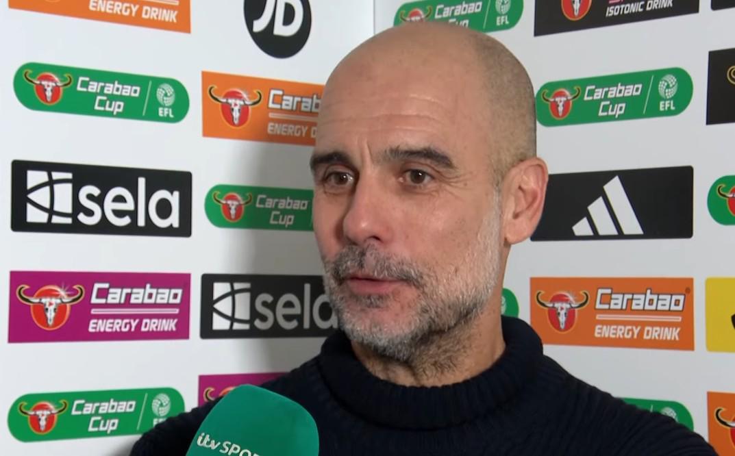 英联杯半决赛首回合,曼城客场2-0击败纽卡,赛后,曼城主帅瓜迪奥拉接受了ITV的采访。
