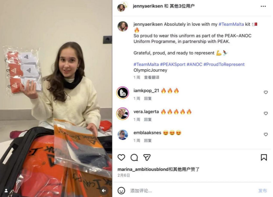 奖牌之外,匹克的合作名单中还有一群特殊的“探索者”——来自西非贝宁的22岁高山滑雪选手齐博佐,成为这个热带国家参加冬奥会的历史第一人。尽管只有一人参赛,但齐博佐的出现,让全球媒体记住了贝宁,也记住了提供装备支持的匹克。菲律宾的塔卢拉·普鲁克斯成为该国首位参加冬奥的女子运动员,马耳他的珍妮·埃里克森也成为该国参加冬奥越野滑雪的第一人。珍妮在收到匹克装备后,专门制作开箱视频,兴奋地向粉丝展示全套定制装备——从滑雪服到训练鞋,每一件都承载着对冬奥梦想的支持。对于这些非传统冰雪强国,奖牌或许遥远,但参与本身已是突破。