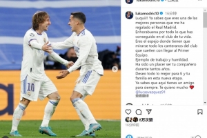 莫德里奇社媒晒出与巴斯克斯的合照,并写道:“卢基!你知道的,你是我在皇马遇到的最好的人之一。”